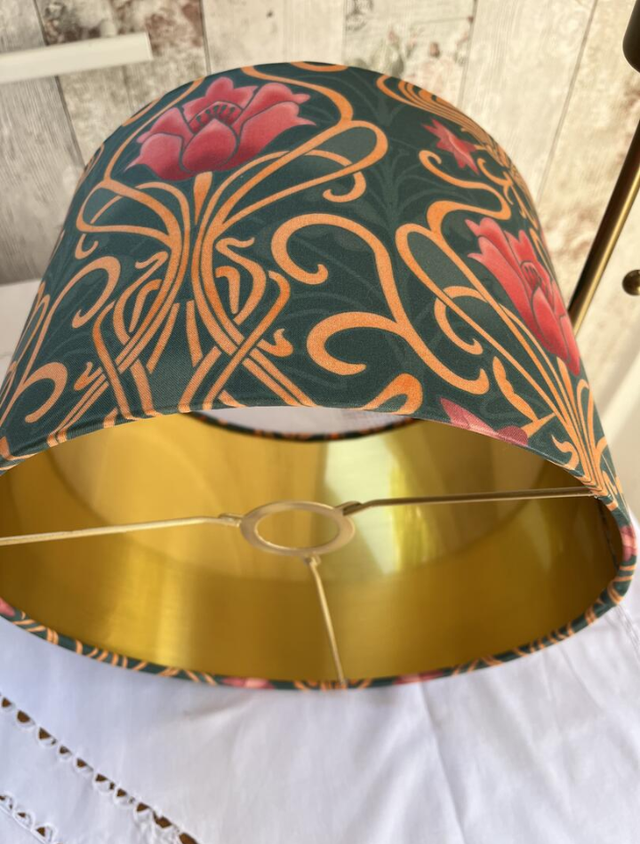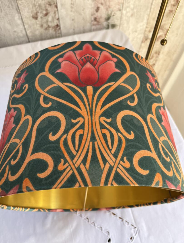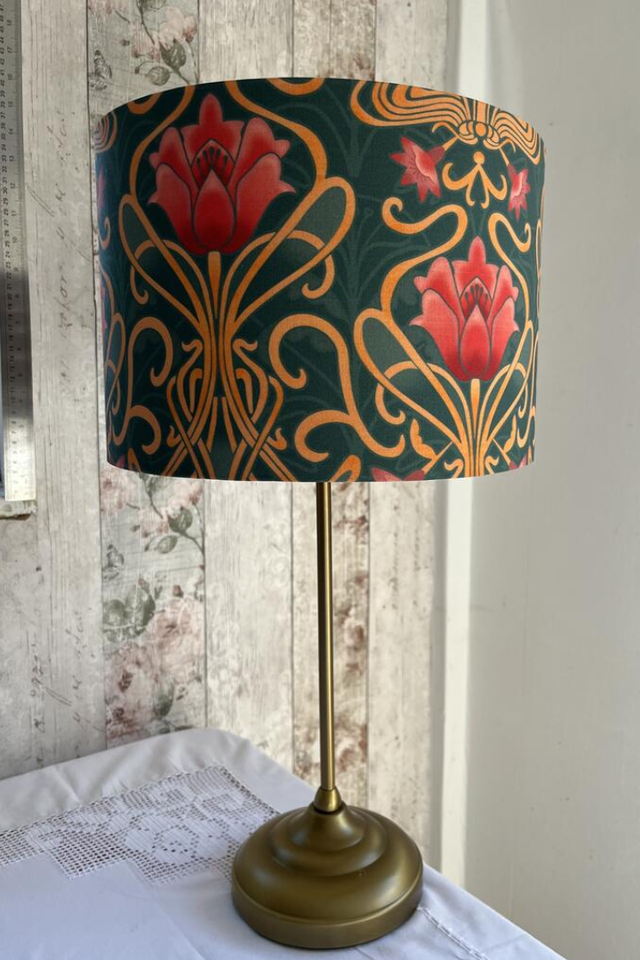 The Art Nouveau Floral Drum Lampshade brings bold elegance and vibrant colour to your home. Red and pink flowers intertwine with flowing orange motifs on a deep green background, echoing the organic curves of the Art Nouveau period.