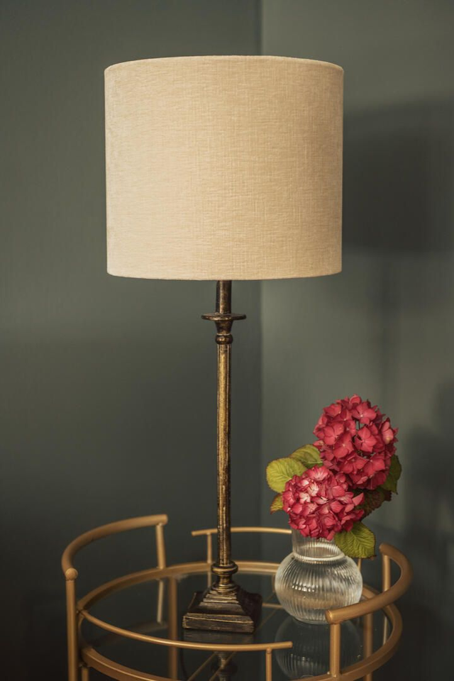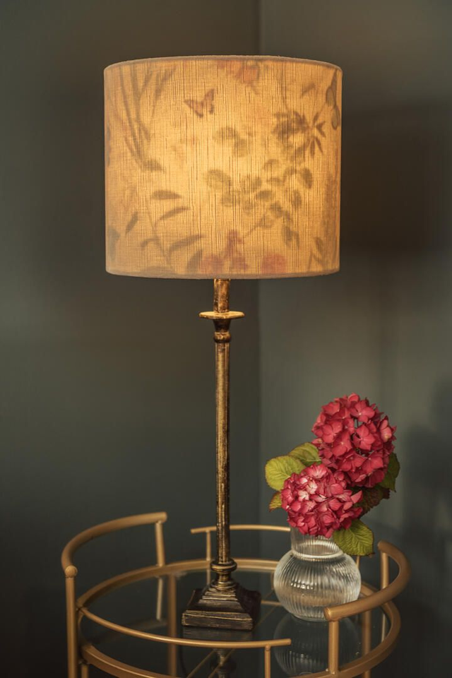 The Cream Velvet Double-Sided Drum Lampshade is a statement in contrast and beauty. Outside, luxurious cream velvet offers subtle elegance and timeless appeal. Inside, a vivid floral and butterfly design bursts to life in greens, oranges, deep aubergine, and soft pink, creating a playful surprise.