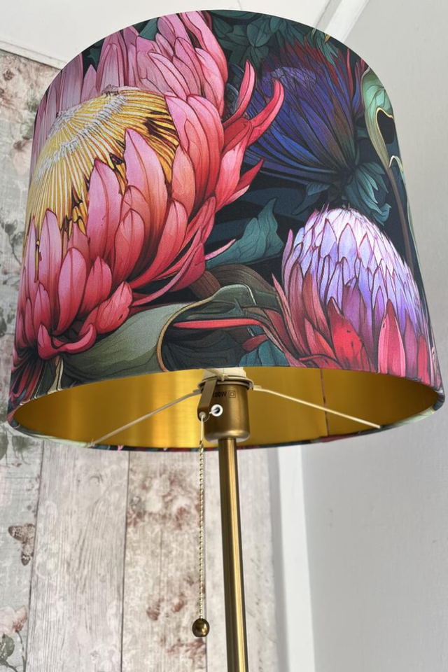 The Protea Flower Drum Lampshade brings flourishing beauty and vibrant energy into your home. Bold pink petals, fresh greens, and golden-yellow accents create a joyful, painterly design inspired by the protea flower, a symbol of courage and resilience.