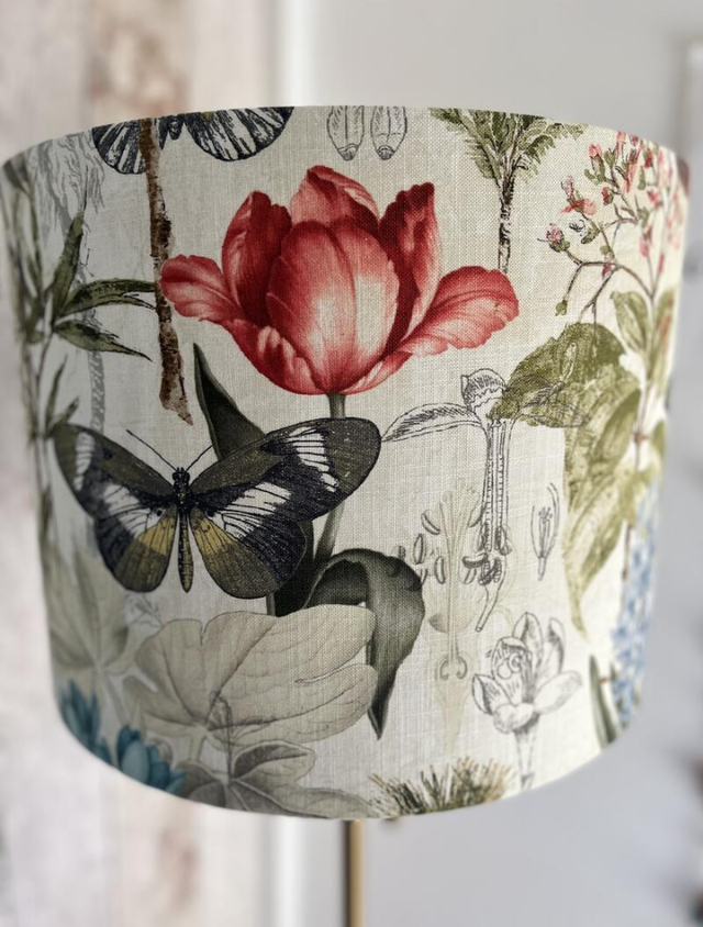 The Seed Sketch Botanicals Drum Lampshade captures the quiet beauty of historic natural studies. Muted greens, soft greys, pale blues, and faded reds layer against delicate pencil sketches of seeds, creating a refined, timeless design.