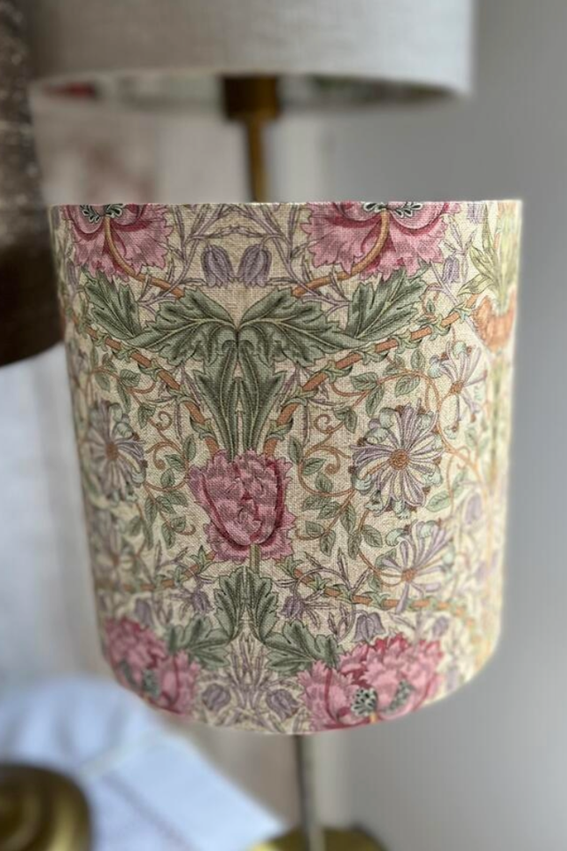 Celebrate timeless design with the William Morris Floral Drum Lampshade. Handmade from 100% cotton in soft pinks and greens on a cream background, this shade brings heritage charm into any interior.